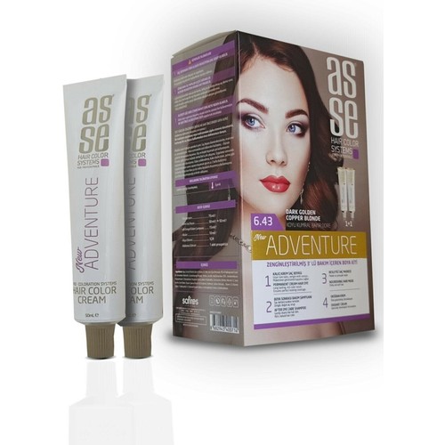 Asse tarafından geliştirilen Adventure Set Saç Boyası, Kalıcı ve Canlı Renkler 1+1 İki Kullanım Seti (No:6.43 Koyu Kumral Bakır Dore), cildinize ihtiyaç duyduğu bakımı sağlamak için özel olarak formüle edilmiştir.